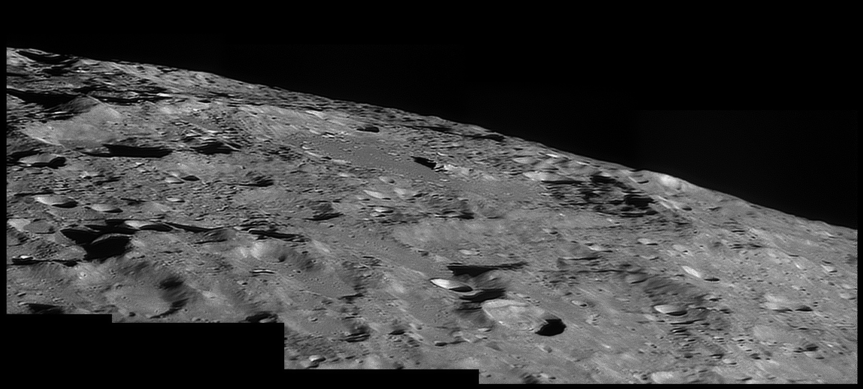 Drygalski. This rarely seen large crater along the extreme southern limb of the Moon can only be well seen during favourable librations. It is 149km in diameter. 2009/09/09. C14 & SKYnyx 2.0M.