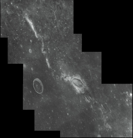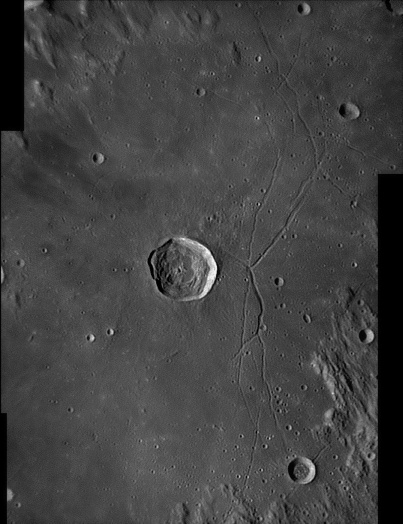 Rimae Triesnecker. To the east of the crater Triesnecker (26km diameter) is the extensive rille system of the Rimae Triesnecker. These are thought to have been formed from tectonic forces beneath the surface. They extened roughly 200km in length. 2009/09/09. C14 & SKYnyx 2.0M.