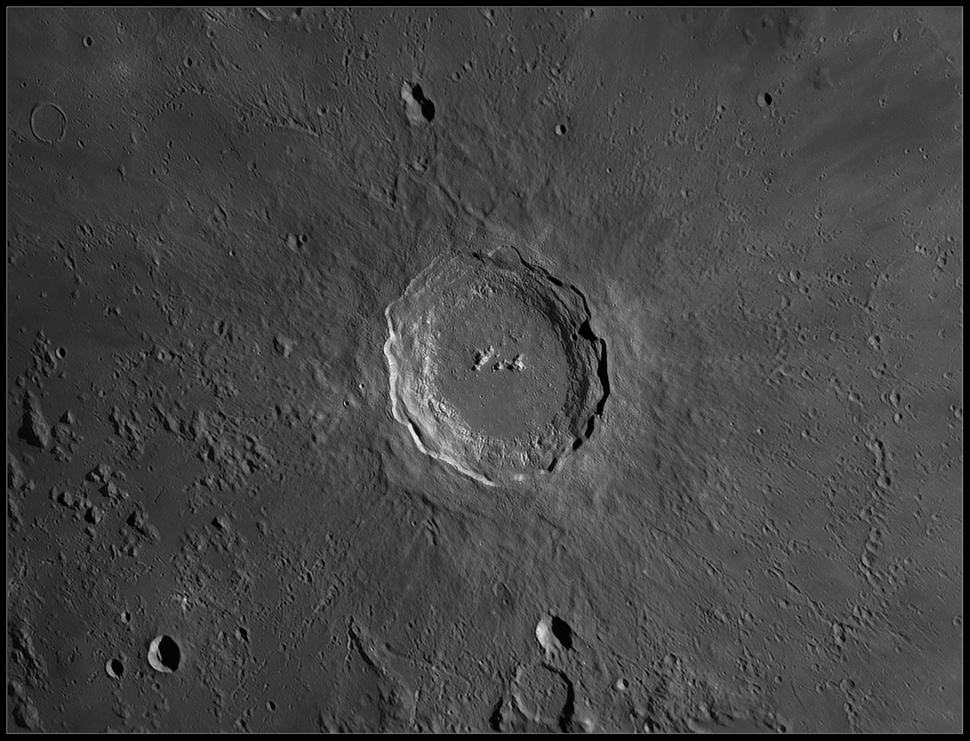 This young lunar impact crater that lies between the Oceanus Procellarum to the west and Mare Insularum in the east. Kepler is most notable for the prominent ray system that covers the surrounding maria. The rays extend for well over 300 kilometers, overlapping the rays from other craters. Kepler has a small rampart of ejecta surrounding the exterior of its high rim. The outer wall is not quite circular, and possesses a slightly polygonal form. The interior walls of Kepler are slumped and slightly terraced, descending to an uneven floor and a minor central rise.