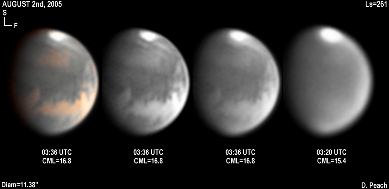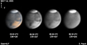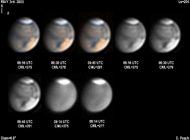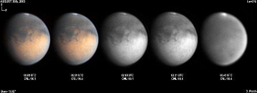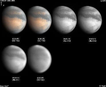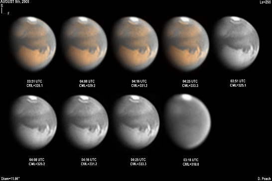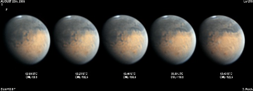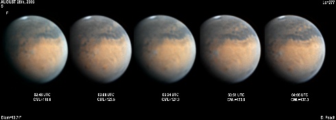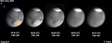 Again the regions of Aurorae Sinus (with its projecting "fingers"), Solis Lacus and Mare Erythraeum are all prominent in this series of images. Also a bright north polar hood obscures Mare Acidalium. 14" Schmidt Cassegrain @ F40. Lumenera Lu075M CCD camera.