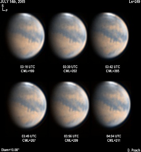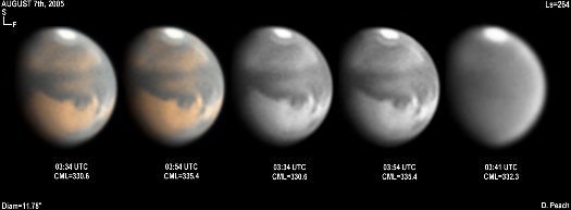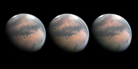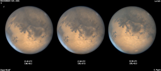 The regions of Aurorae Sinus (with its projecting "fingers"), Solis Lacus and Mare Erythraeum are all prominent in this series of images. Also a bright north polar hood obscures Mare Acidalium. Olympus Mons can also be seen on the morning limb. 14" Schmidt Cassegrain @ F40. Lumenera Lu075M CCD camera.