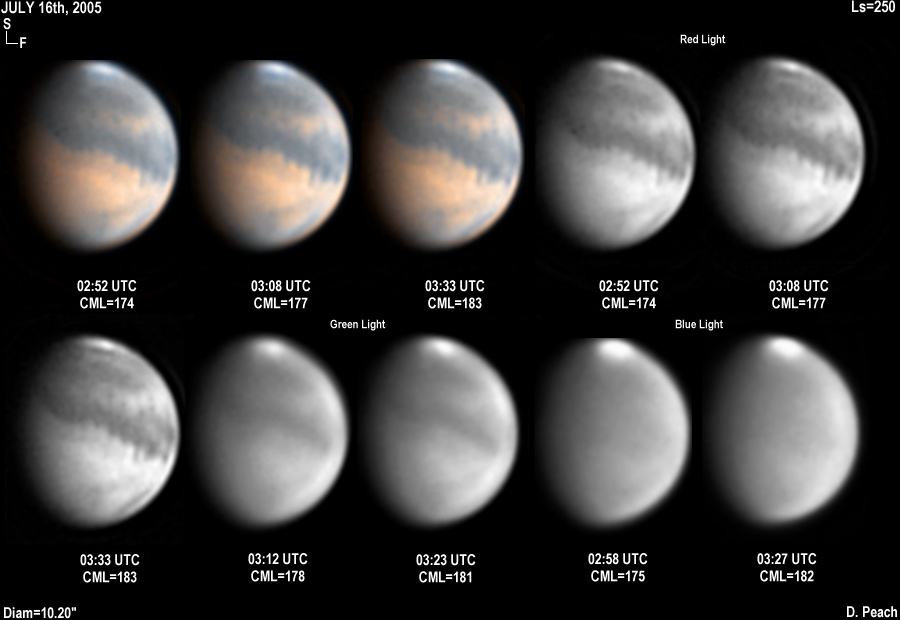 Solis Lacus is agaiin central in these images. Olympus and Ascraeus Mons also appear dark again in Blue. A weak haze is present of Argyre on the evening terminator, while further weak clouds are present over Candor and Tharsis. 14" Schmidt Cassegrain @ F39. Lumenera Lu075M CCD camera.