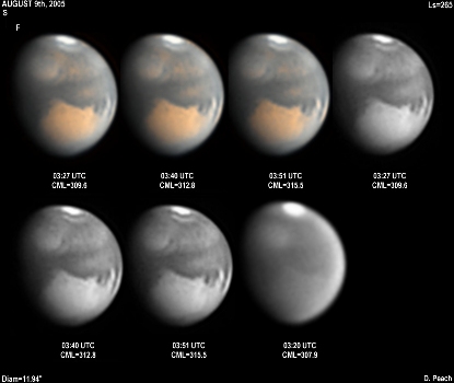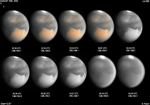 In this long series, a significant dust cloud was captured across Argyre, with smaller dust cores present across Chryse and Mare Erythraeum. The dust activity it best seen in the last three images in the sequence. 9.25" Schmidt Cassegrain @ F42. Lumenera Lu075M CCD camera.