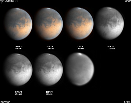 Mare Erythraeum is central in these images, with Mare Acidalium covered with a brilliant and disturbed NPH. The Indus "canal" is seen connecting Nillacus Lacus with Oxia Palus. Aurorae Sinus is prominent, as is Coprates/Melas Lacus. 14" Schmidt Cassegrain @ F40. Lumenera Lu075M CCD camera.