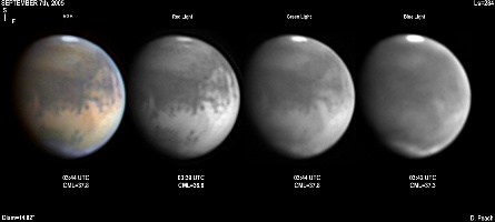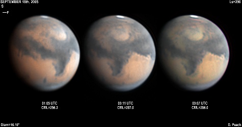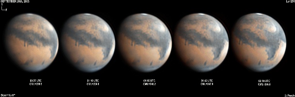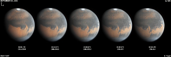 During late September Mars started to grow to a reasonable size on its way to its closest approach at the end of October 2005. The region of Mare Cimmerium is central in this series of images across three nights, with a wealth of fine detail visible across the Martian disk 14" Schmidt Cassegrain @ F39. Lumenera Lu075M CCD camera.