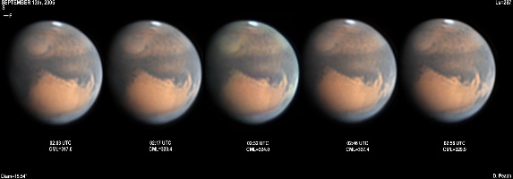 Sinus Meridiani is on the meridian in these images. Note the faint spots projecting from it (and Oxia Palus.) Several misty morning clouds can be seen, along with a bright NPH. Syrtis Major/Hellas are also seen on the evening limb. 14" Schmidt Cassegrain @ F40. Lumenera Lu075M CCD camera.