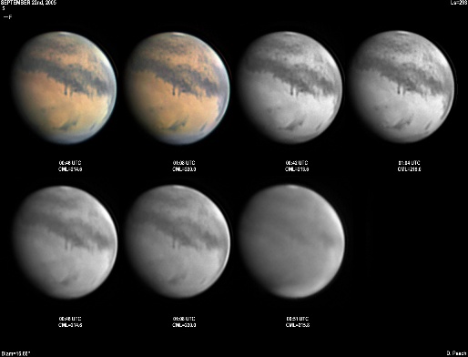Mare Cimmerium is central in these images with delicate channels visible across Hesperia and Ausonia. A faint cloud is visible close to Elysium, while the North Polar Hood has become brighter. 14" Schmidt Cassegrain @ F39. Lumenera Lu075M CCD camera.