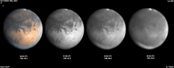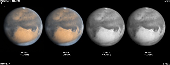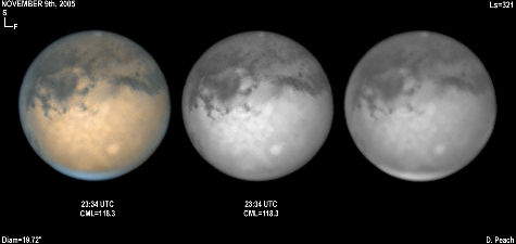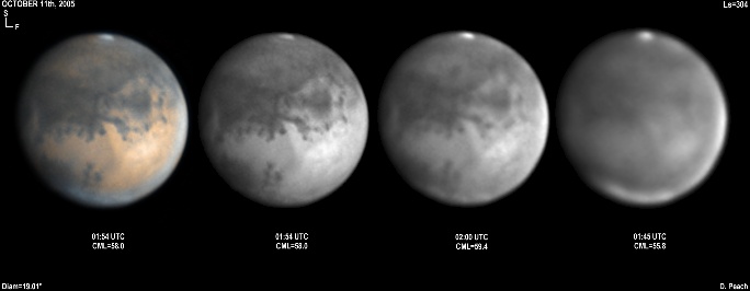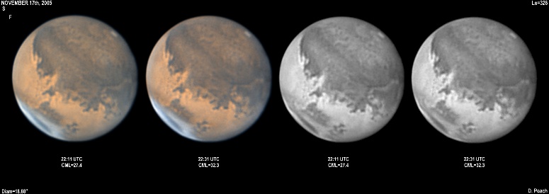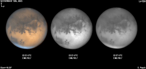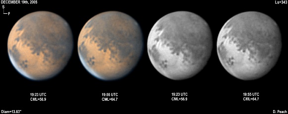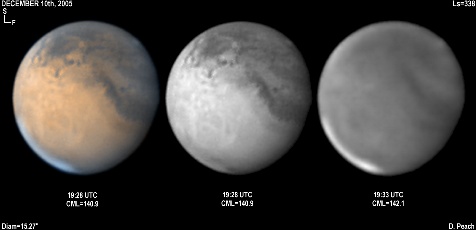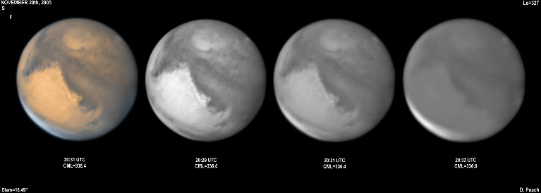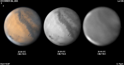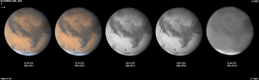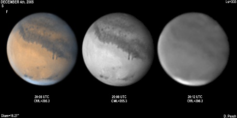 November 29th, 2005. Ls=332. Diam=17.10". Syrtis Major and Hellas are prominent in these images. The Martian phase is increasing notably, and the diameter is already 15% smaller than opposition. Note the very dark Mare Serpentis in the Blue Light image. 14" Schmidt Cassegrain @ F40. Lumenera Lu075M CCD camera.
