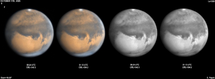 Mare Erythraeum is central in these images, with Argyre to the south covered in a light mist. Juvenatae Fons is dark, as is the entire complex of Valles Marineris. A prominent misty north polar hood is present over Mare Acidalium, with notable condensations within it. A weak haze is present extending over Candor/Ophir into Tharsis. 14" Schmidt Cassegrain @ F39. Lumenera Lu075M CCD camera.