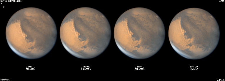 All four Tharsis volcanoes can be seen in this series of images darkening as they approach the evening terminator. Solis :Lacus is all present in the early images showing complex details. 14" Schmidt Cassegrain @ F39. Lumenera Lu075M CCD camera.