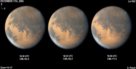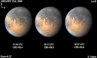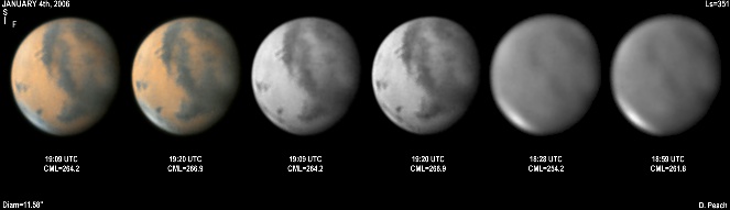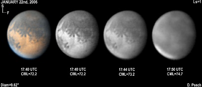 January 17th, 2006. Ls=358. Diam=10.10". Solis Lacus and Tharsis are present well in these images. Ascraeus Mons appears as a dark spot, while Olympus Mons is also faintly seen as a dusky spot. The NPH remians bright, with a faint cloud across Ausonia. 14" Schmidt Cassegrain @ F40. Lumenera Lu075M CCD camera.