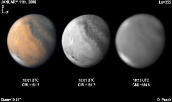 January11th, 2006. Ls=355. Diam=10.76". Mars grows smaller in the evening sky. These images show the Mare Sirenium hemisphere. Note the brilliant white cloud at left over the Arsia Mons volcano. The South Polar Hood is forming, and the cap will start to increase in size again beneath the hood. The NPH remians brilliant. 14" Schmidt Cassegrain @ F40. Lumenera Lu075M CCD camera.