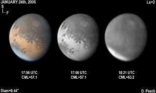 January 24th, 2006. Ls=2. Diam=9.44". Argyre is very well seen with a bright cloud over the basin in Blue. The NPH is very bright at these longitudes. The fingers of Aurorae Sinus are dark and prominent. The SPH is misty and extending northward. 14" Schmidt Cassegrain @ F40. Lumenera Lu075M CCD camera.