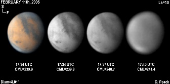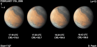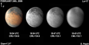 February 24th, 2006. Ls=17. Diam=7.21". Solis Lacus is well seen in these images. Note also the small dark spots of the Tharsis volcanoes are clearly seen. The SPH is dense and bright, while the NPC can again be seen. 14" Schmidt Cassegrain @ F40. Lumenera Lu075M CCD camera.