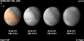 February 18th, 2006. Ls=14. Diam=7.55". Mare Sirenum/Cimmerium is central with the projections of Gomer Sinus visible. Elysium is bright but cloud free with the small dots of Trivium-Cerberus seen. Propontis is prominent. The thick SPH remians prominent. NPC again seen. 14" Schmidt Cassegrain @ F40. Lumenera Lu075M CCD camera.