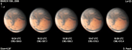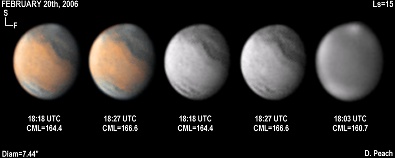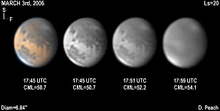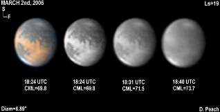 March 15th, 2006. Ls=25. Diam=6.29". Syrtis Major is prominent in these images appearing rather narrow and pointed. Hellas is misty and the NPC is shining brilliantly. 14" Schmidt Cassegrain @ F40. Lumenera Lu075M CCD camera.
