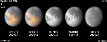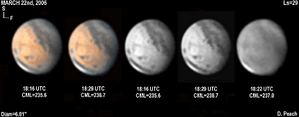 March 22nd, 2006. Ls=29. Diam=6.01". The Elysium hemisphere is central in these images, with Elysium itself appearing as a brighter patch. The NPC is brilliant, with some mist over Syrtis Major and Ausonia. Gomer Sinus is visible despite D=6". 14" Schmidt Cassegrain @ F40. Lumenera Lu075M CCD camera.