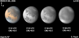 March 4th, 2006. Ls=20. Diam=6.79". Similar details to the previous day, but the amount of cloud activity seems to have notably increased, with the Argyre cloud merging into the SPH, a weak haze over Chryse, and some remians of the NPH. Note the bright cloud over Nilokeras. 14" Schmidt Cassegrain @ F40. Lumenera Lu075M CCD camera.