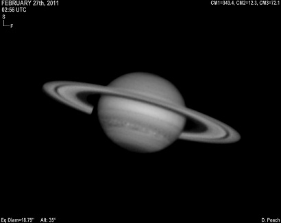 Saturn, February 27th, 2011. Poor seeing. This IR band image shows the stormy Northern Temperate region.