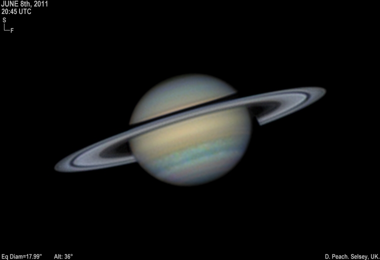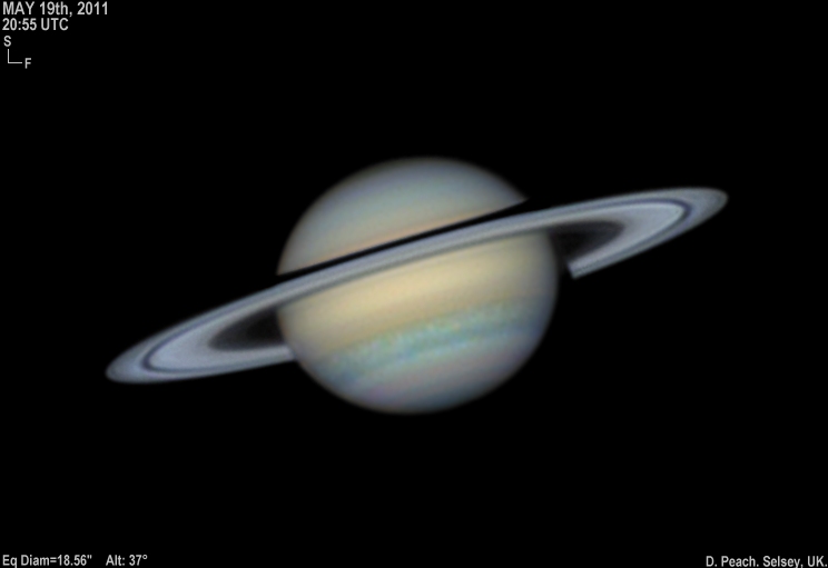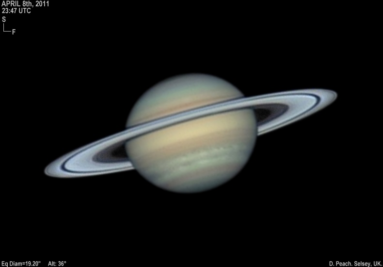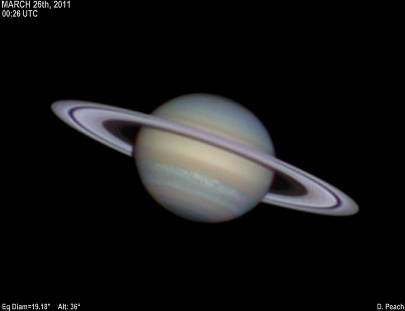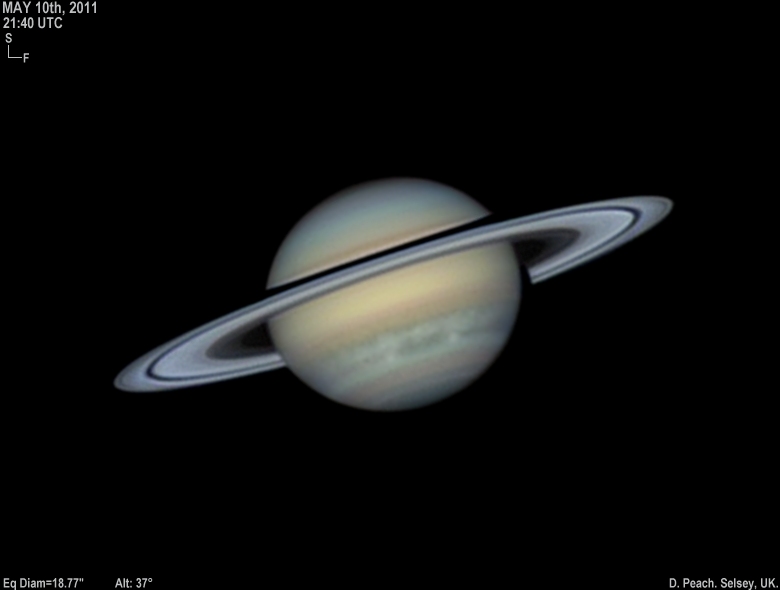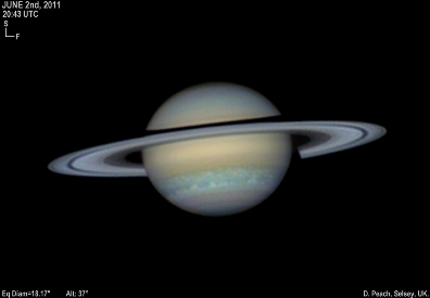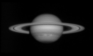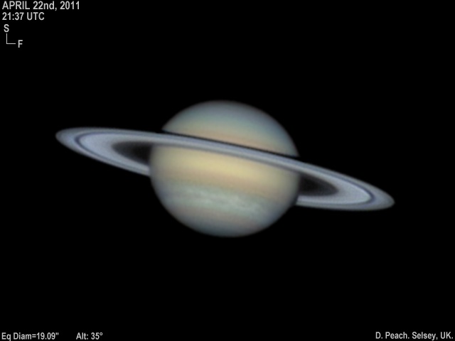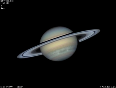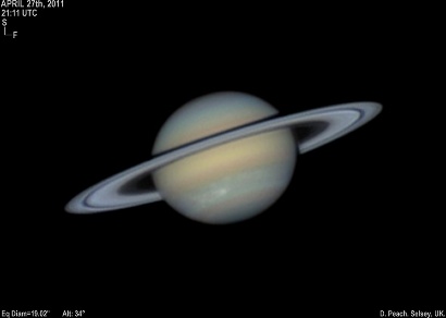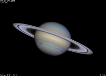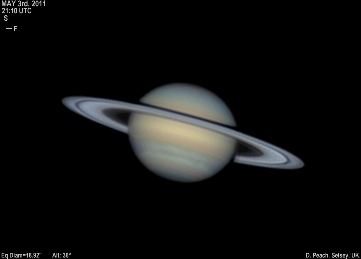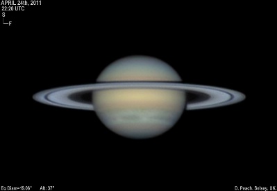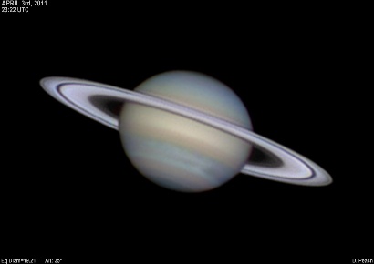 Saturn, April 24th, 2011. Under fair seeing conditions. The stormy North Tropical Zone is apparent with a large diffuse dark spot present.