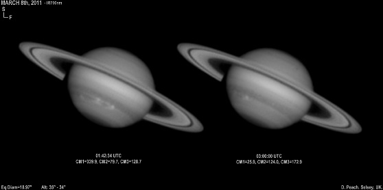 Saturn, March 26th, 2011. Storm activity is again apparent. Spokes visible rotating in the B-ring can be seen in the animation at right.