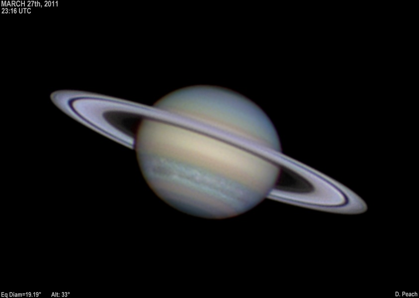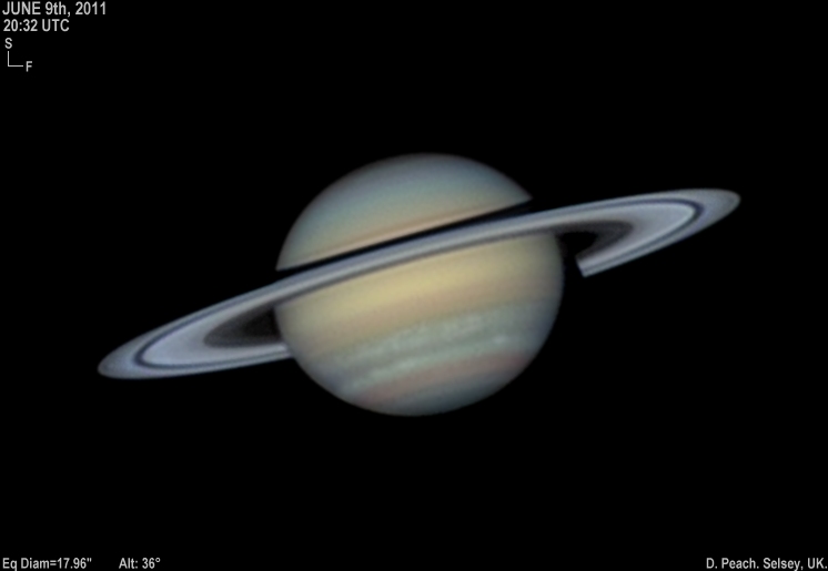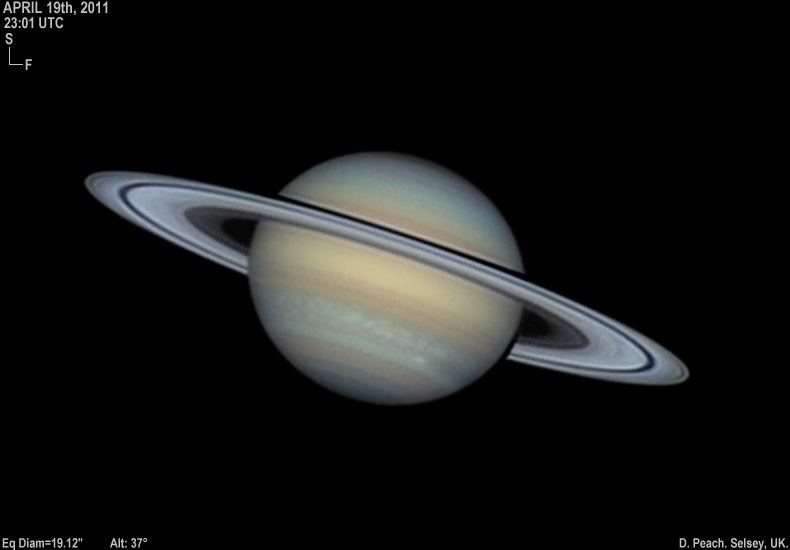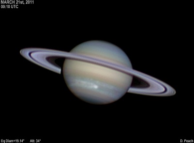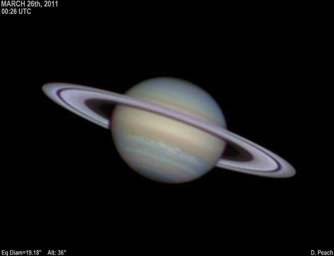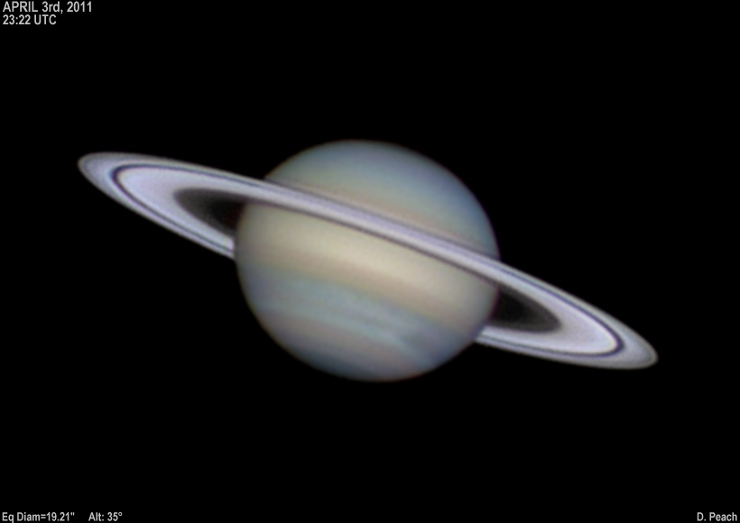 Saturn, April 3rd, 2011. The Planet very close to opposition with the rings having brightened noticeably due to the Seeliger Effect.