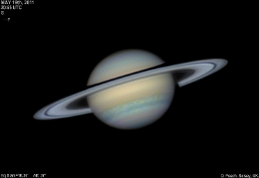 Saturn, April 22nd, 2011. Under rather poor seeing conditions. The stormy North Tropical Zone is apparent.
