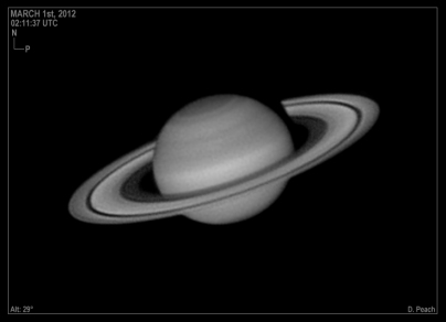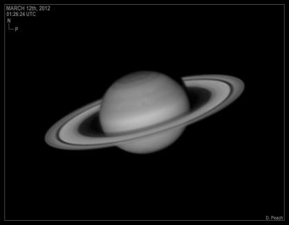 Saturn, March 1st, 2012. Good seeing but poor transparency preventing any colour imagery.