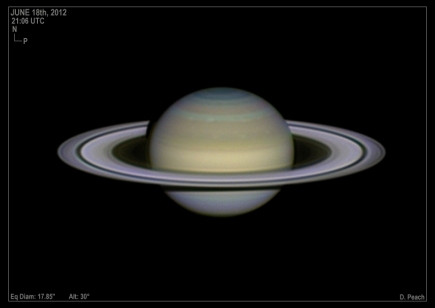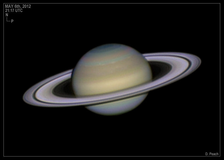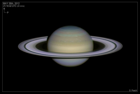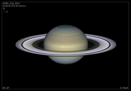 Saturn, April 21st, 2012. Excellent seeing for the altitude. Various coloured bands and zones are apparent.