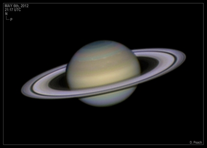 Saturn, May 6th, 2012. Fair seeing. Some faint spots visible on the disk.