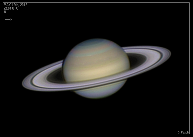 Saturn, May 12th, 2012. Fair to good seeing. Faint spots again visible across the disk.