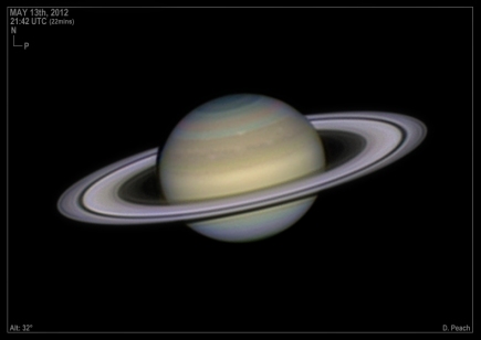 Saturn, May 13th, 2012. Good seeing. Various spots visible across the planet.