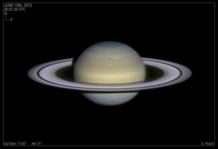 Saturn, June 19th, 2012. Good seeing. A notable dark spot with bright streak alongside is prominent near the disk centre.