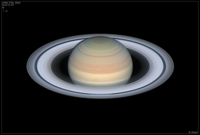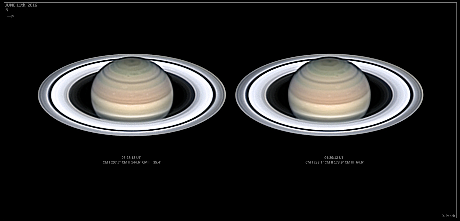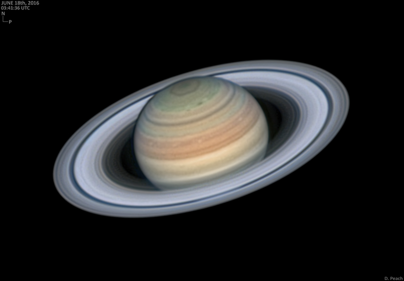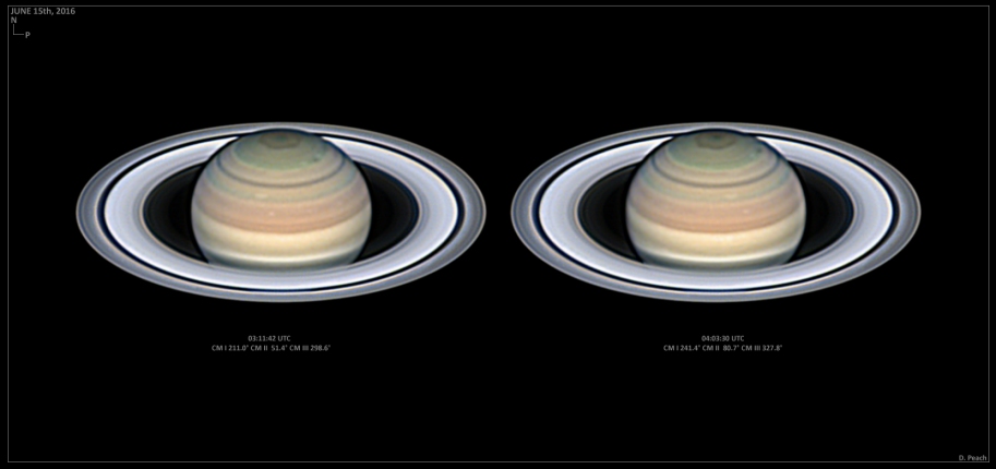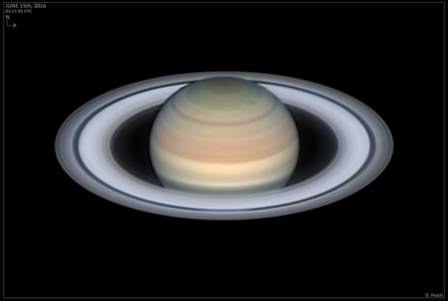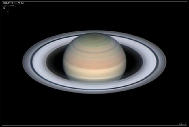 June 11th, 2016. Excellent seeing conditions. Various small storms are visible across the planet. Note the polar hexagon is also clearly seen.