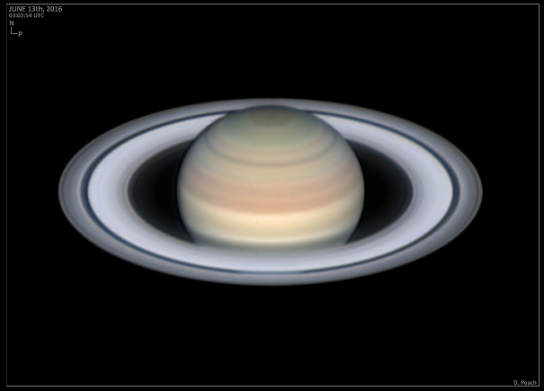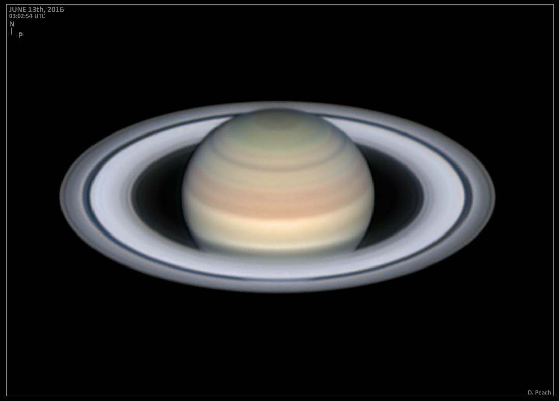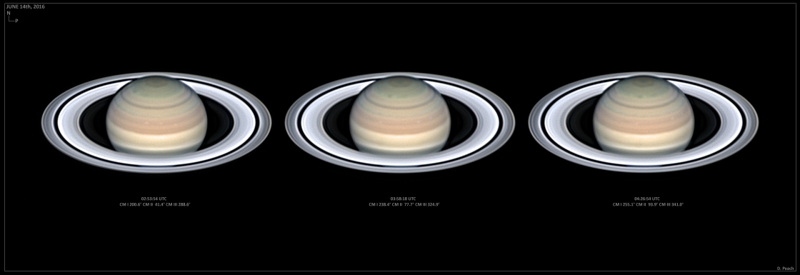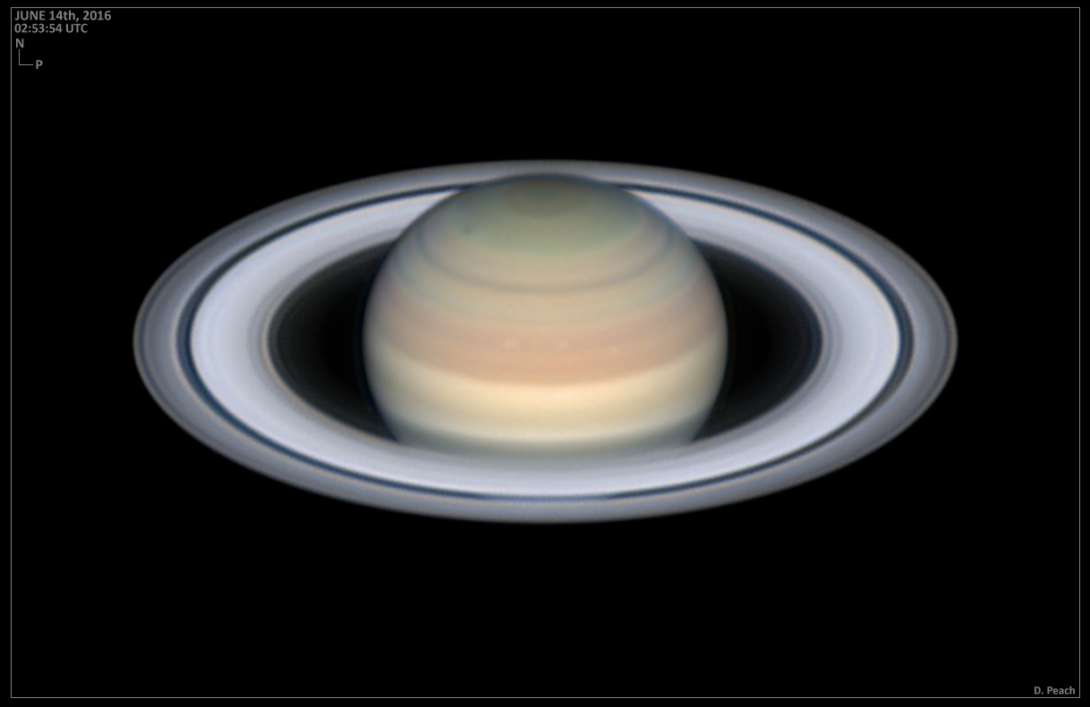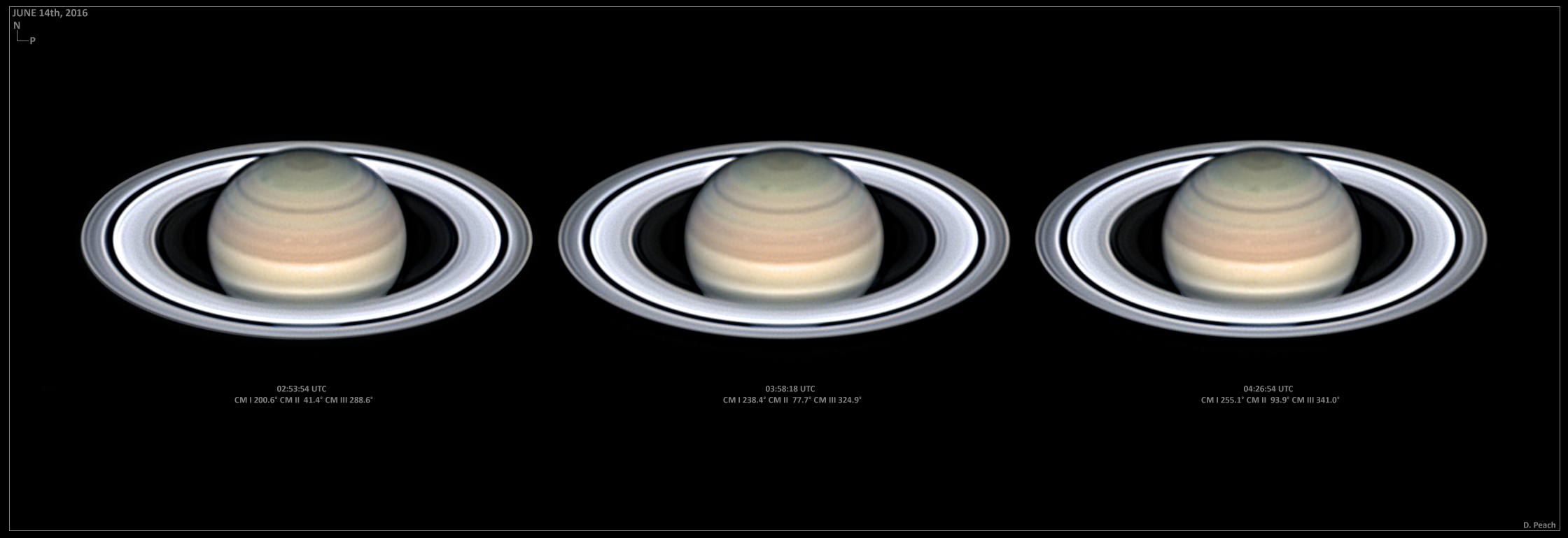 June 11th, 2016. Excellent seeing conditions. Various small storms are visible across the planet. Note the polar hexagon is also clearly seen.