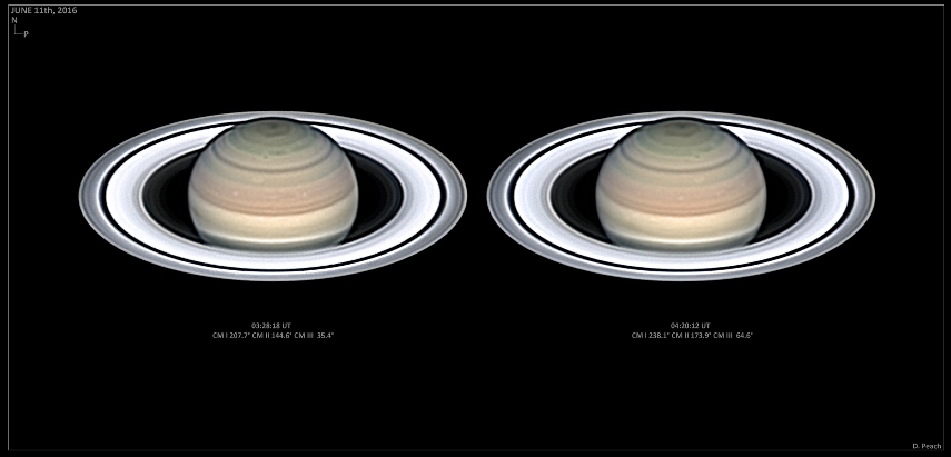 June 18th, 2016. Another session of near perfect seeing conditions. Many storms are visible across the planet along with fine detail within the ring system. Left image is a new processing of this data done in 2020.