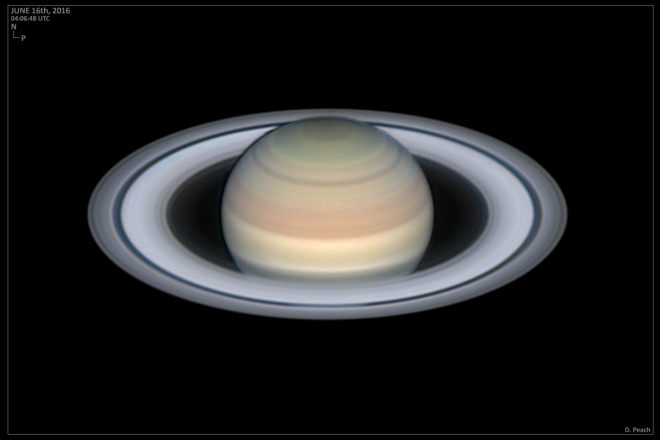 June 5th, 2016. Excellent conditions. The planet just one day past exact opposition. The rings are bright due to the Seeliger effect.