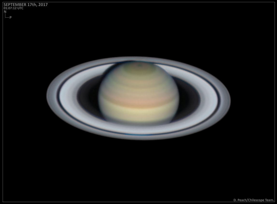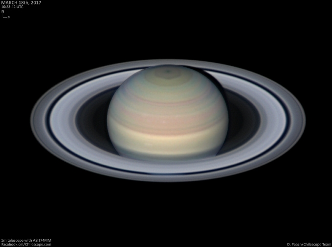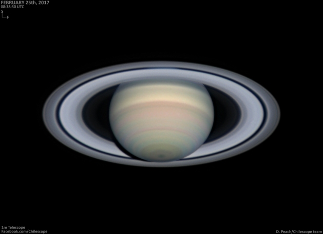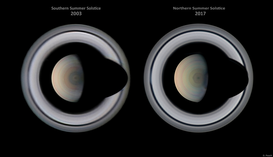 The northern and southern solstice on Saturn showing the differing appearances of the two hemispheres fourteen years apart. Note the southern polar region lacks a hexagon shaped jetstream that is so prominent in the north.