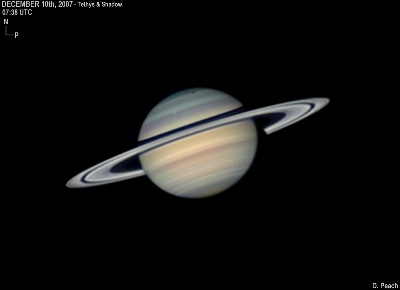 Saturn on December 10th, 2007. Note the transit of Tethys and its shadow across the northern hemisphere.