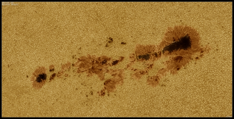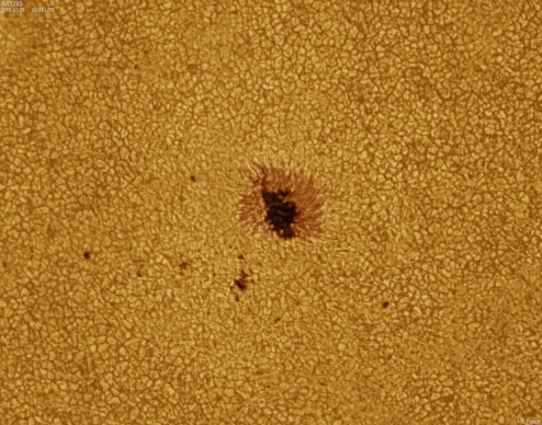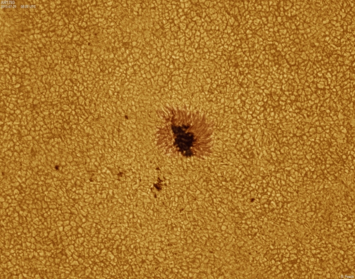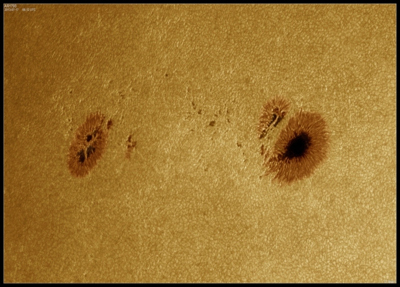 July 21st, 2013 - AR11793: Some moments of good seeing conditions. The two spots of the group continue to change and develop. Note the well defined granulation surrounding the spots each granule being a convection cell around 1000km in size.