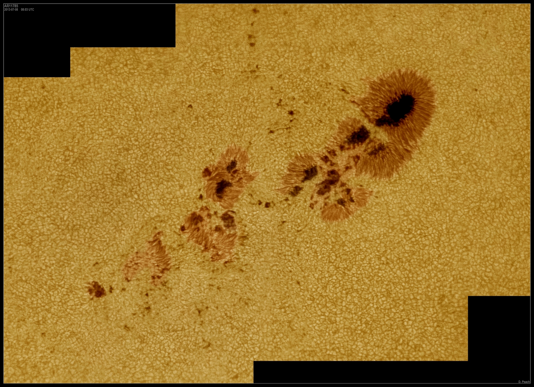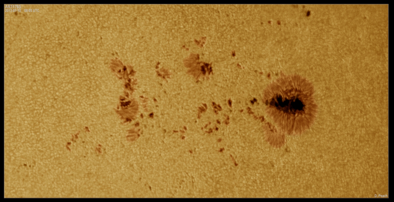 July 6th, 2013 - AR11785: Large sunspot AR11785. One of the largest sunspots so far observed during 2013 this group put on a good show through the first half of July. The high resolution view shows the active region in detail as well as the surrounding solar granulation. This image also featured as NASA's Astronomy Picture of the day.