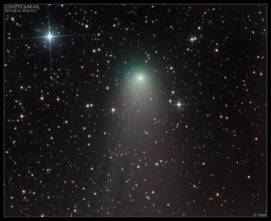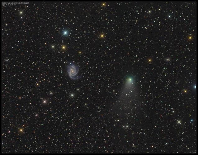 Discovered on November 5th, 2012 by the LINEAR survey. It came to perihelion during mid August 2013 and reached 8th magnitude displaying a fine dust tail and a distinct greenish coma.