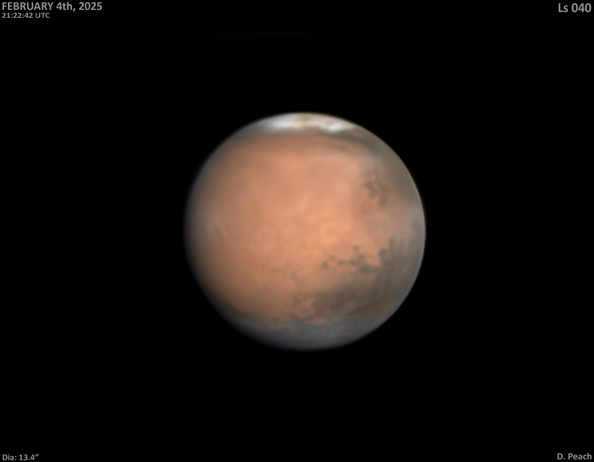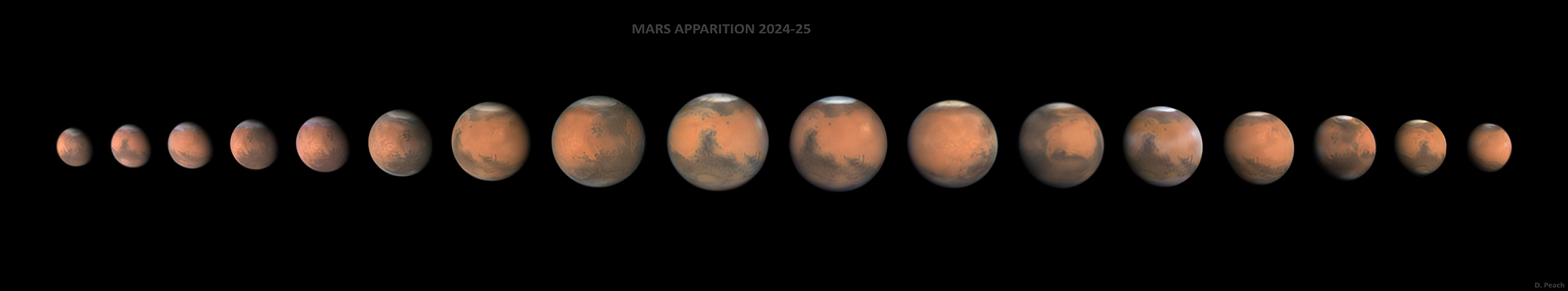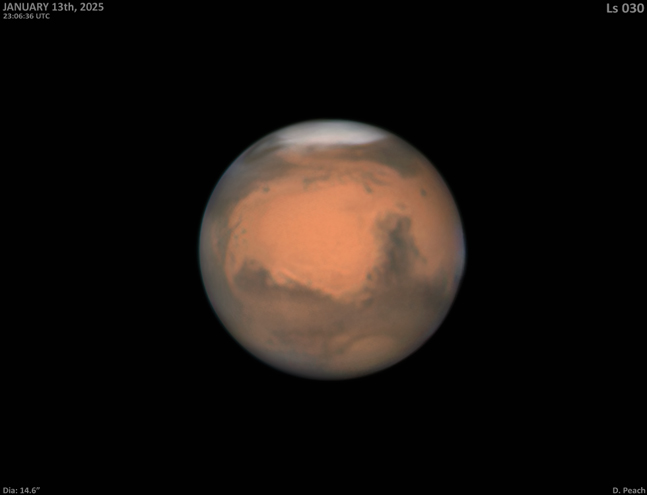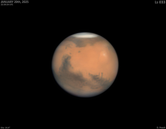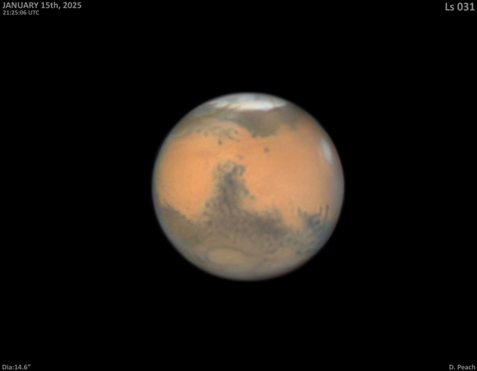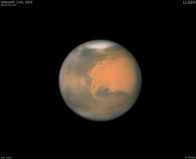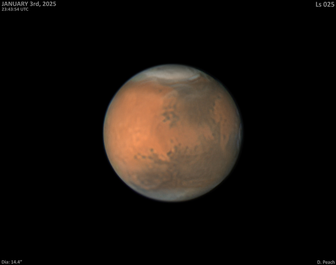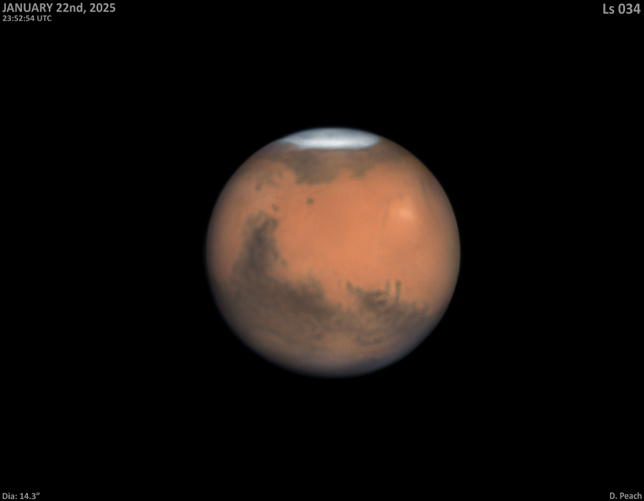 Close approach: January 16th, 2025. Apparent Opposition Diameter: 14.6". Declination:+25°01'. Constellation: Cancer