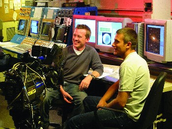Filming inside the INT. This photo shows presenter Chris Riley, and Astronomer Romano Corradi in the control room of the Issac Newton Telescope. It was quite remarkable to watch the incredible live images of objects such as M27 appear on screen taken by the 2.5m INT.