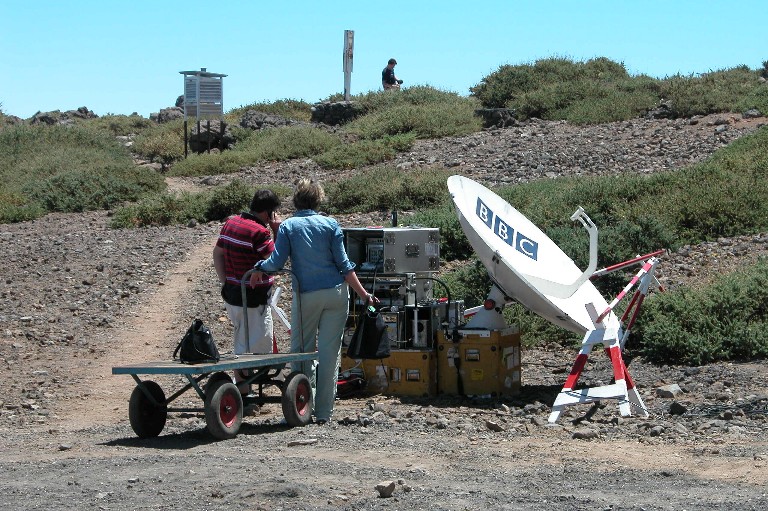 Calling Home. The only way to transmit from the remote mountain top site, was by the use of a satellite link-up seen here.