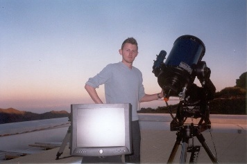 The Observing Begins. A photo of myself next to the Meade 10" Schmidt Cassegrain that was used for all observations and images. The telescope was mounted on a large wooden platform, with superb views of almost the entire sky, with the added benefit of being sheltered from the often present winds at the observatory.