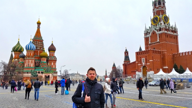 In Red Square with St Basil's Cathedral at left and the Kremlin at right.