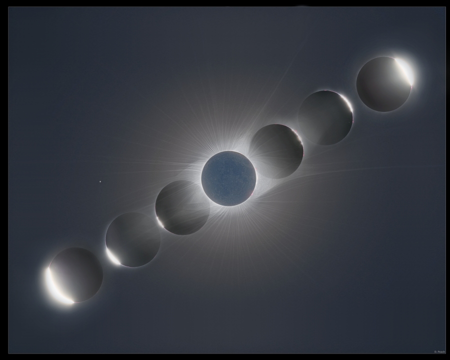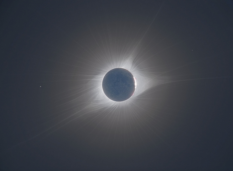 Totality processed to represent the visual appearance observed in binoculars. Many fine coronal streamers could be seen.